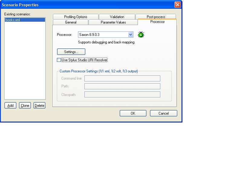 I define a scenario that uses the Saxon 8.9.0.3 engine. (Independently of Stylus Studio, I have already successfully run this stylesheet using Saxon 8.9).