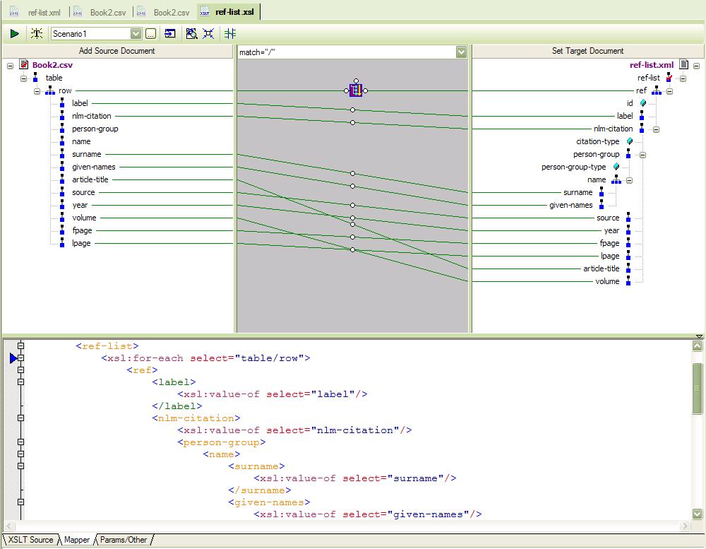 usually when converting from CSV to XML you use the XML Converter functionality of Stylus Studio, then design an XSLT stylesheet using Mapper to build the desired output structure.