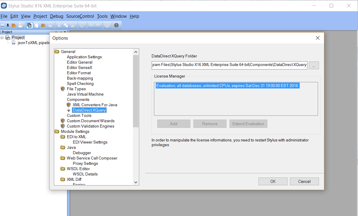 Once you have purchased the DataDirect XQuery license you will obtain a control code which you will input in the license manager. Stylus Studio will ask to restart. Restart Stylus Studio as administrator and the DataDirect jar library will be updated with the new license.