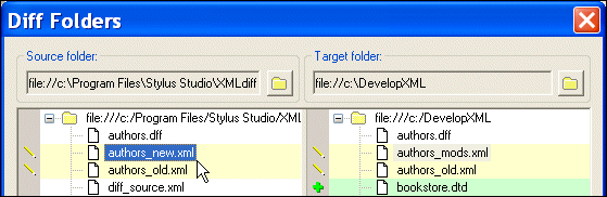 Home > Online Product Documentation > Table of Contents > Diffing Folders Diffing FoldersStylus Studio allows you to diff two folders. As shown in Figure 147, the Diff Folders dialog box displays the contents of each folder; symbols and colors, described in Symbols and Background Colors, identify the types of changes in the respective folders.