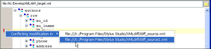 Clicking on a document in this menu changes the current focus to that source document, allowing you to easily navigate to the same node in a different document. The additional symbols used by Stylus Studio when diffing multiple documents are described in Table 17.