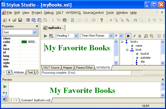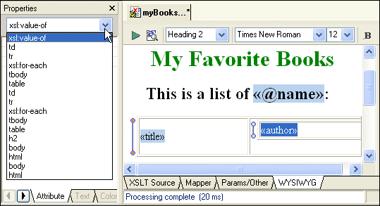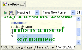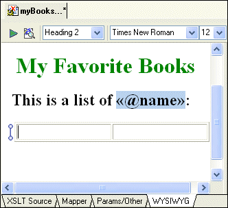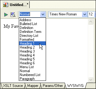 Home > Online Product Documentation > Table of Contents > Getting Started with the XSLT WYSIWYG Editor Getting Started with the XSLT WYSIWYG EditorThis section provides instructions for getting started with the XSLT WYSIWYG editor. It introduces the basic WYSIWYG editor features, and provides background information needed to edit simple stylesheets. You should perform the steps in each topic before you move on to the next topic. After the first topic, some steps in subsequent topics depend on actions you performed in a previous topic. This section is organized as follows: Creating Static HTMLTo create static HTML: