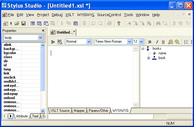 WYSIWYG tab, is empty. A tree that represents the XML source document,