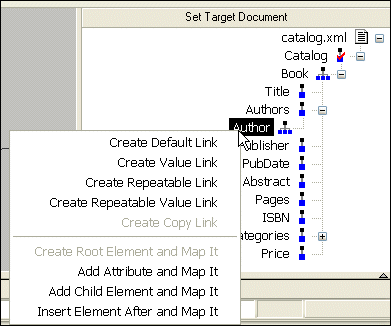 If you use the left mouse button to perform the drag operation, the link always maps the source node to the target node without making any changes to the target structure. If you use the right mouse button, Stylus Studio displays a shortcut menu that provides you with alternatives for modifying the target structure.