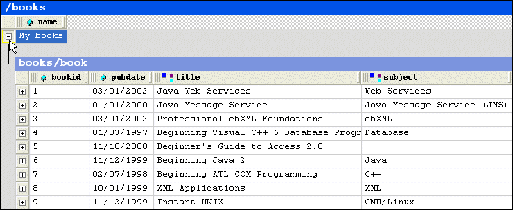 <book> element. To preserve space in the grid, the tag names of child elements are not displayed as a separate column in the table. Rather, as shown in