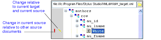 Notice that: Table 18 shows the symbols that might appear based on changing values to the node in question. The example illustrated in Figure 156 is shown in the first row. As values in the source documents change, Stylus Studio changes the diff symbol accordingly.