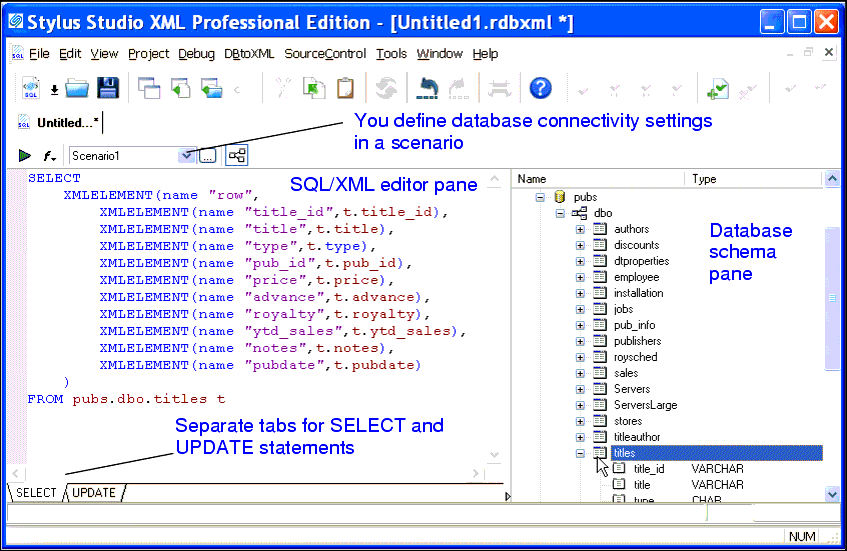 SQL/XML Editor PaneThe SQL/XML editor pane is on the left side of the DB-to-XML Data Source Editor. It consists of two tabs, SELECT and UPDATE, which you use to compose SQL/XML SELECT and, optionally, UPDATE and INSERT statements. You can type directly in the editor, or you can use drag-and-drop to automatically compose SQL/XML statements. See Composing SQL/XML in Stylus Studio to learn more about using the SQL/XML editor. Database Schema PaneThe database schema pane is on the right side of the DB-to-XML Data Source Editor. Once you have established a connection to the database specified in the scenario, Stylus Studio displays a tree diagram of the database schema pane.