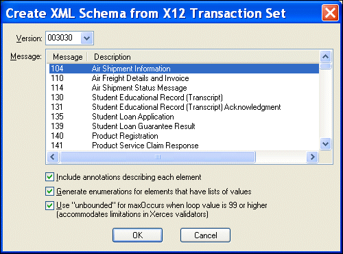 Home > Online Product Documentation > Table of Contents > Creating XML Schema from X12 Transaction Sets Creating XML Schema from X12 Transaction Sets