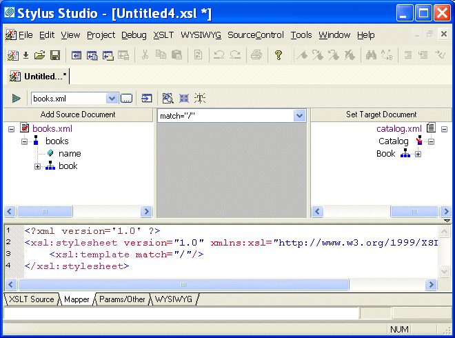 Stylus Studio displays tree diagrams of these XML documents. The default XSLT source code has not been altered at this point.