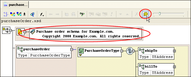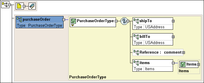 NodesEach node displayed in the diagram pane is represented by its own symbol; tool tips, which are displayed when you hover over a node in the diagram, identify the node's type (element, attribute, sequence, and so on). The symbols used in the diagram are summarized in Table 1.