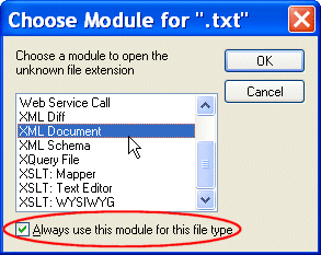 You can add your own file types to this list, specify the module you want them opened in, and, optionally, specify Stylus Studio as the default application for viewing and editing files of that type. See Adding File Types to Stylus Studio. Opening Unknown File TypesWhen you try to open a file of a type that is not recognized by Stylus Studio, Stylus Studio displays the Choose Module for dialog box, which allows you to specify the module or editor you want to use to open the file.