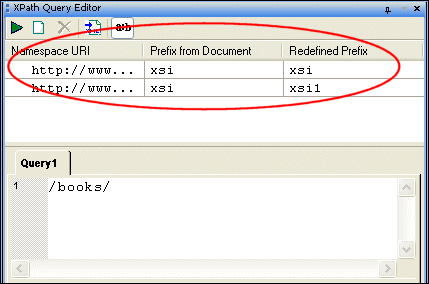 In addition to the namespace URI, Stylus Studio displays the namespace prefix defined in the XML document. If one namespace prefix defined in the XML document clashes with another, the second prefix is redefined by adding a number to the end of the original prefix name to make it unique - for example, if two namespaces had the prefix myPrefix, the second would be redefined as myPrefix1. Namespace prefixes are redefined only in the context of the XPath Query Editor; namespace definitions in the XML document are unaffected. You must use redefined namespace prefixes when writing your query expressions, though you can specify your own redefined name if you like. Redefined namespaces Changes saved to the XML document are reflected in the namespace pane when you click on the namespace pane or query pane. To change a redefined namespace prefix: