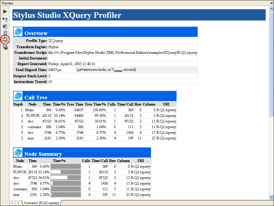 In addition to debugging tools for XQuery, Stylus Studio provides the XQuery Profiler, a tool that helps you evaluate the efficiency of your XQuery. By default, the performance metrics gathered by the XQuery Profiler are displayed in a preformatted report, like the one shown here: