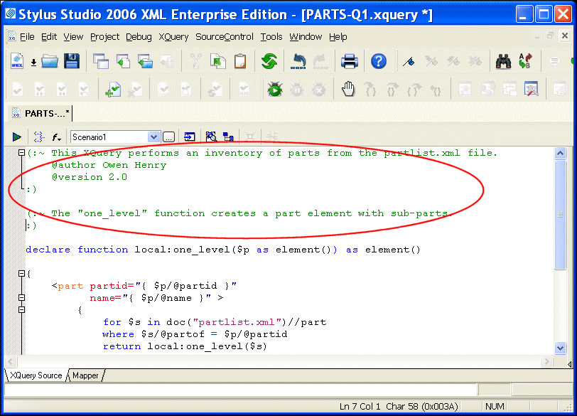 All other comments must precede function declarations. xqDoc uses the text you enter to provide a description for each function listed in the Function Summary. The same description is used in the Function Detail. Here is an illustration of the XQuery document in the XQuery Editor; the xqDoc comments are highlighted: