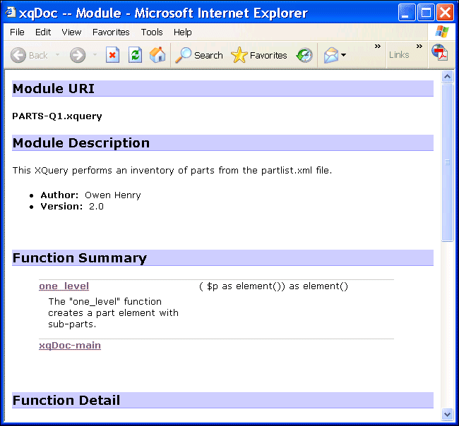 The first comment in an XQuery document is interpreted by xqDoc as the Module Description. Within that comment, xqDoc recognizes certain keywords preceded by the at (@) sign. Examples include @author and @version. See the xqDoc documentation at http://www.xqdoc.org for more information. Here is a report for the same document shown in Figure 350 with a user-defined module and function descriptions.