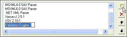 You should replace the default name (Validation Engine 1, for example) with the name you want to associate with the custom validation engine. The name you enter is displayed in the drop-down in the XML Editor. Custom validation engines are displayed in the Validate Document drop-down list in the order in which they appear here. You can change the custom validation engine order by