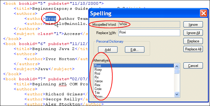When you have addressed all identified errors in the document (either by replacing, correcting, or ignoring them), the Spell Checker stops. Using the Personal DictionaryThe Stylus Studio Spell Checker comes with its own dictionary. You can create a personal dictionary and fill it with your own entries. Personal dictionaries are used in conjuction with the Spell Checker dictionary across all Stylus Studio editors. To add entries to the personal dictionary, you can