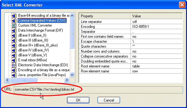 Note that XML Converter name and properties used in the converter URL vary from the full names displayed in the Select XML Converter dialog box. In addition, note that only properties whose default value you change in the Value field are displayed in the URL field.