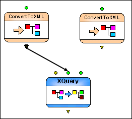 Home >Online Product Documentation >Table of Contents >Setting the XQuery Node Data Sources Setting the XQuery Node Data SourcesAlthough the XQuery code was specified with default data sources, we want the XQuery to use the data sources we defined in the two ConvertToXML nodes we created in Configuring Data Sources. We do this by connecting the output ports on the ConvertToXML nodes to the input ports on the XQuery node. To set an XQuery node's data sources: