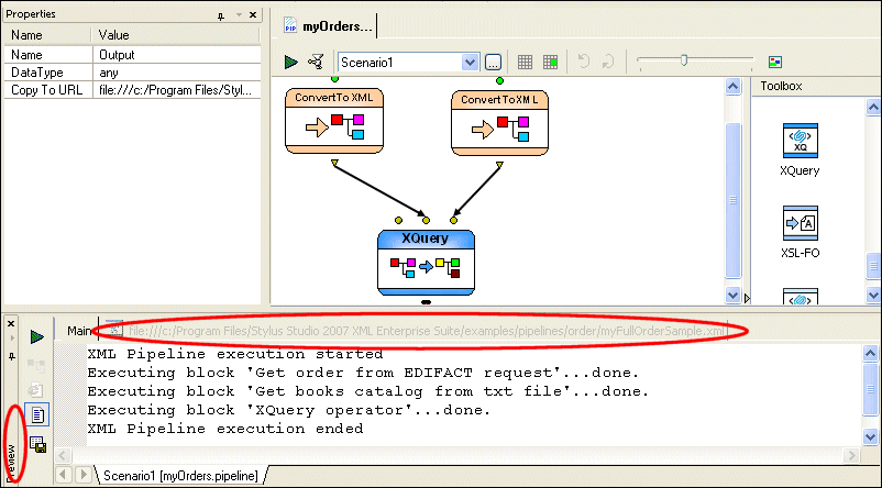 The output port changes color, indicating that it has a value specified for it. If we test the XML pipeline again, we can see that the XML pipeline runs to completion. Stylus Studio displays the Preview window, the Main tab of which displays an execution log that describes the processing steps executed in the XML pipeline.