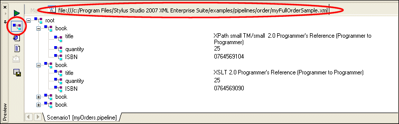 If we click the next tab in the Preview window, we can see the XML output by our XML pipeline in text view. If we click the Preview in Tree button (