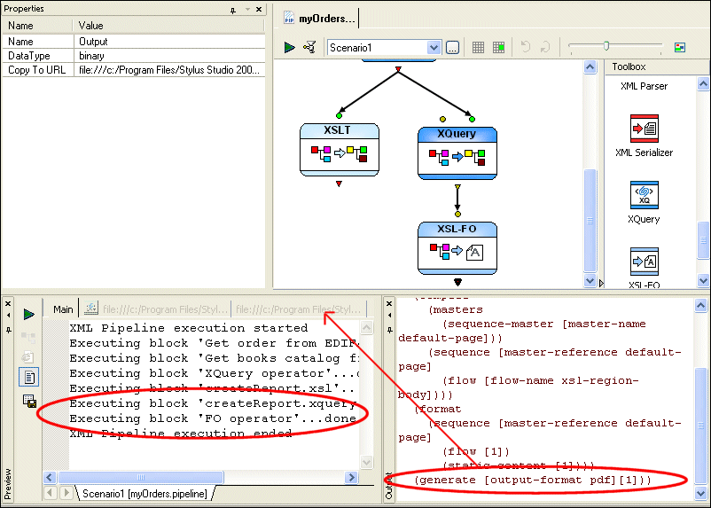 Stylus Studio adds a new XQuery and associated XSL-FO node to the XML pipeline.