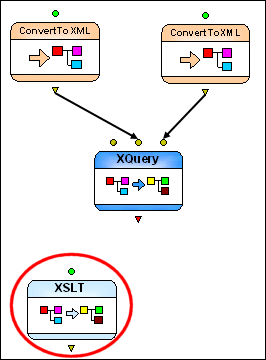 The colored input port indicates that this XSLT node already has a default input and value defined for it. We will specify our own input value (the XML document created by the