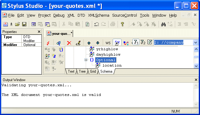 Stylus Studio displays a message in the Output window that indicates that the document is valid.
