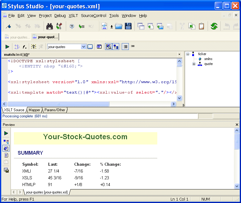 This topic is part of a sequence. If your-quotes.xsl is not open, see Opening a Sample Stylesheet. The sequence starts with Exploring the XSLT Source Tab.