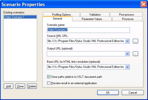 This topic is part of a sequence. If To apply a stylesheet to an XML document in Stylus Studio, you use a scenario. A scenario is a group of customizable settings that allows you to experiment with different source XML documents (that is, the XML document to which you will apply the XSLT), processors, parameter values, post-processors, and profiling settings. You can also use scenarios to perform validation on the XML document that results from the XSLT processing. (Validation is always performed before any post-processing you specify.)