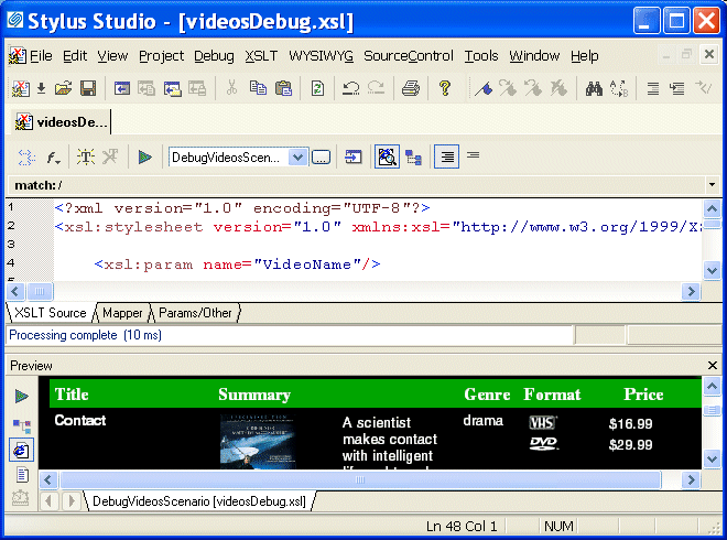 videosDebug.xsl stylesheet, located in the examples\VideoCenter directory where Stylus Studio was installed.