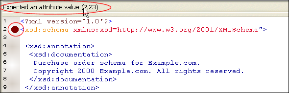 Stylus Studio also flags any XML Schema errors in the text pane - lines that contain errors are identified with a red dot, and the type and location of the error is displayed in the status area at the top of the text pane, as shown here: