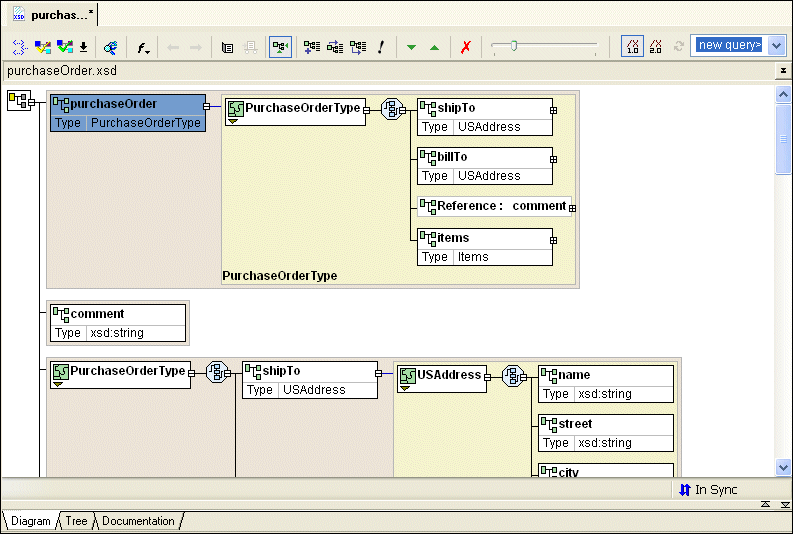 Home >Online Product Documentation >Table of Contents >Introduction to the Diagram Tab Introduction to the Diagram TabThe recommended way to define an XML Schema in Stylus Studio is to start with the Diagram tab of the XML Schema Editor, which is shown in Figure 53.