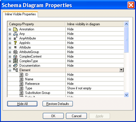 You can change the display for classes of nodes (all elements, for example) using the Schema Diagram Properties dialog box, shown in . (In addition, the Properties window displays all the properties for any node you select.)