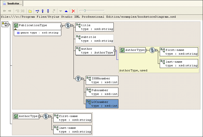 Adding Elements to a Sample complexType in the Diagram ViewThis topic is part of a sequence that begins with Description of Sample XML Schema. The elements belonging to this complexType must occur in a specific order. Before defining the first element, you need to create a sequence node to define this requirement in the XML Schema. To add the title element to the PublicationType complexType:
