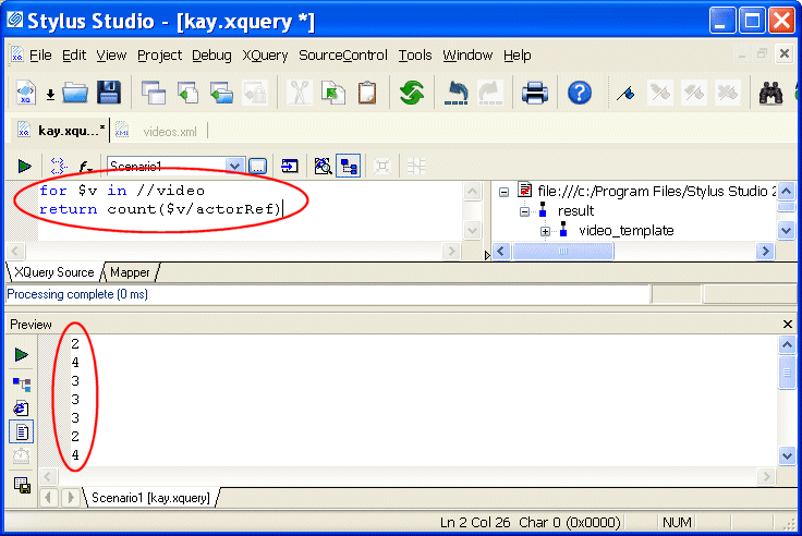 You can run this in Stylus Studio or in Saxon, using the example videos.xml file as input. (Tips on setting up these tools are described in the previous section, An XQuery Primer.) Here's the output from Stylus Studio: