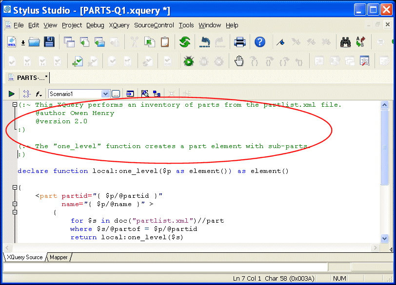 All other comments must precede function declarations. xqDoc uses the text you enter to provide a description for each function listed in the Function Summary. The same description is used in the Function Detail. Here is an illustration of the XQuery document in the XQuery Editor; the xqDoc comments are highlighted: