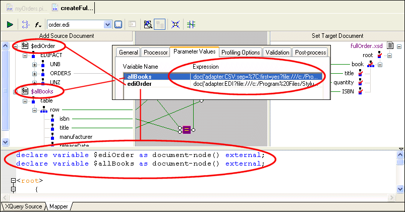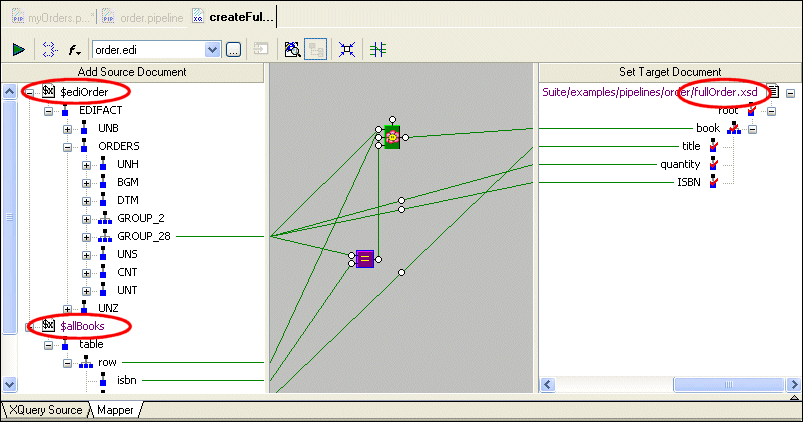 To join data from these different documents we will use an XQuery document created using the XQuery Mapper. Once we have defined that XQuery document, we can add the XQuery node to our XML pipeline. Using Variables to Reference Data Sources