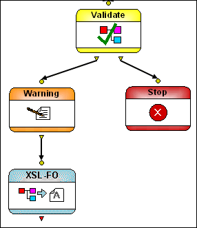Home > Online Product Documentation > Table of Contents > Stop and Warning Nodes Stop and Warning NodesStop and Warning nodes are used to indicate exceptions to or special conditions encountered in an XML pipeline's execution. They serve a similar purpose, but behave in different ways. Stop NodesFigure 422, for example, shows a Stop node piped to the Output invalid output port of the Validate node - if the validation using the XML Schema specified in the Validate node fails, the Stop node aborts XML pipeline processing, and a user-defined error message is generated. Stop nodes do not have an output port - XML pipeline processing ends if it encounters a Stop node.