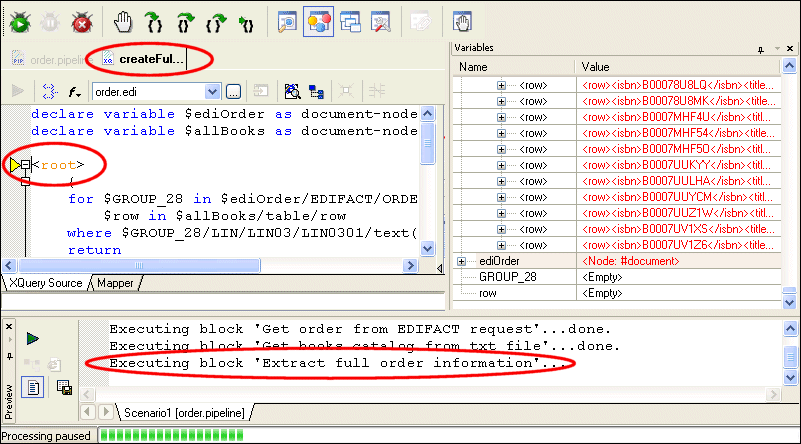 If we want to take a closer look at the XQuery node as it processes the input, we can step into it, directly from the XML Pipeline Editor by pressing the