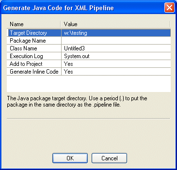 c:\temp\myPipelineJavaCode, for example. If the directory you name does not exist, Stylus Studio creates it when you run the Java Code Generation wizard. The default is