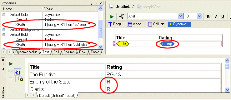 Home > Online Product Documentation > Table of Contents > Format Data Conditionally Format Data ConditionallyThe last action we will perform on the table is to write an XPath expression to display the `R' rating for movies in a bold red.