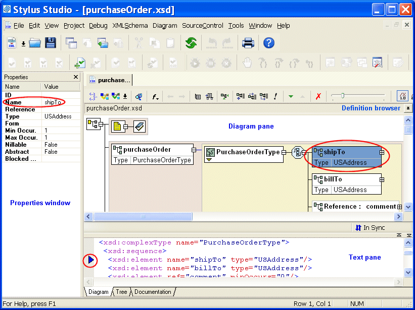 In Stylus Studio, the information in all tabs synchronized automatically. Generally speaking, if you are just getting started with XML Schema you should consider using the Diagram tab to work with XML Schema in Stylus Studio. Its graphical user interface makes defining XML Schema easy and error-free, and the built-in text pane, which lets you see how new nodes are rendered in XML, can be a useful learning tool. To get started using the Diagram view to define an XML Schema, see Defining an XML Schema Using the Diagram Tab - Getting Started. Procedures for working with the Diagram tab are also covered throughout this chapter. |