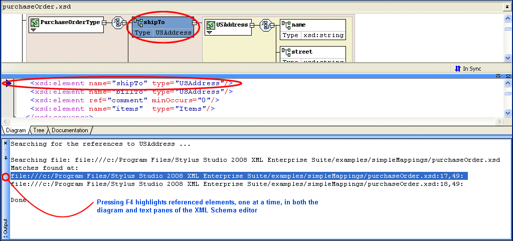 Pressing F4: Pressing F4 again repeats this action for the next search result. To search for referencing nodes in an XML Schema: