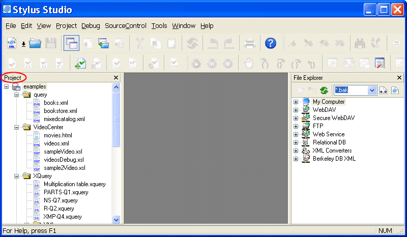When you open Stylus Studio for the first time, Stylus Studio displays the Project window with the examples project. (The File Explorer window is displayed on the right.)
