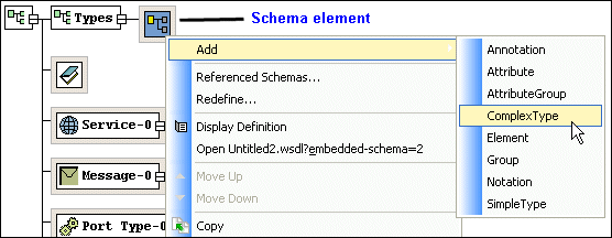 Alternative: Right-click the Definition element and choose Add > Types from the shortcut menu. Stylus Studio adds a Service element to the WSDL. Types Element PropertiesThe Types element has no editable properties. Adding a Schema Element