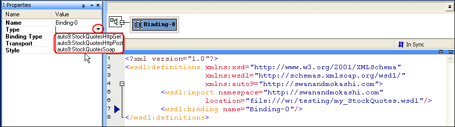 Now, if we load the imported WSDL and then create a Binding element, we see that the