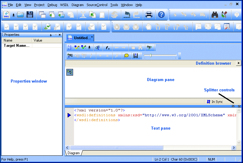 Diagram pane, which contains graphical representations of the elements, attributes, and other nodes that make up your WSDL document.