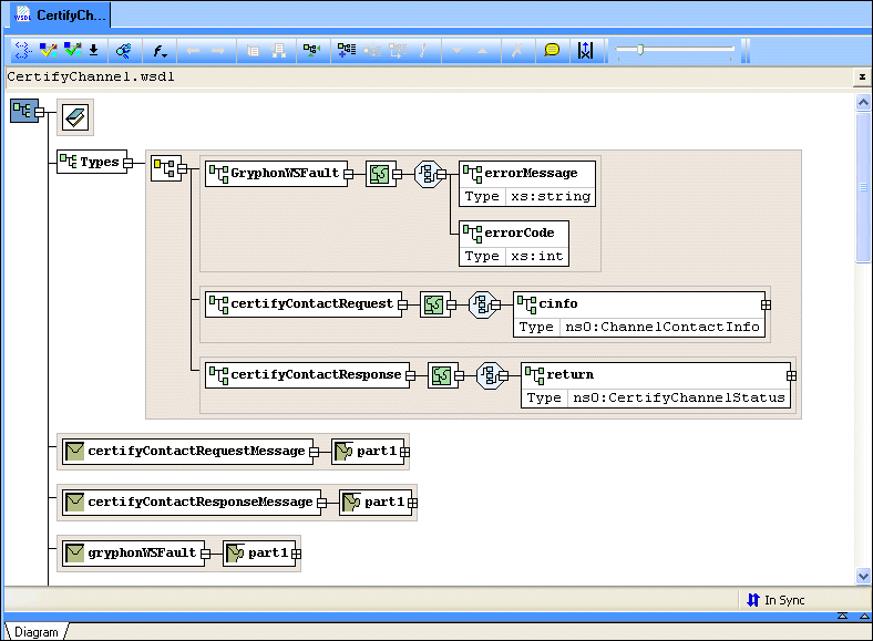Home > Online Product Documentation > Table of Contents > Diagram Pane Diagram PaneThe diagram pane contains graphical representations of the elements, attributes, and other nodes that make up a WSDL document, including elements from any XML Schema associated with the WSDL.