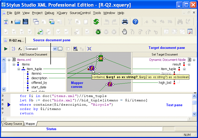 Mapper, is displayed any time the active document within Stylus Studio is an XQuery document. You can use either or both tabs to compose an XQuery.